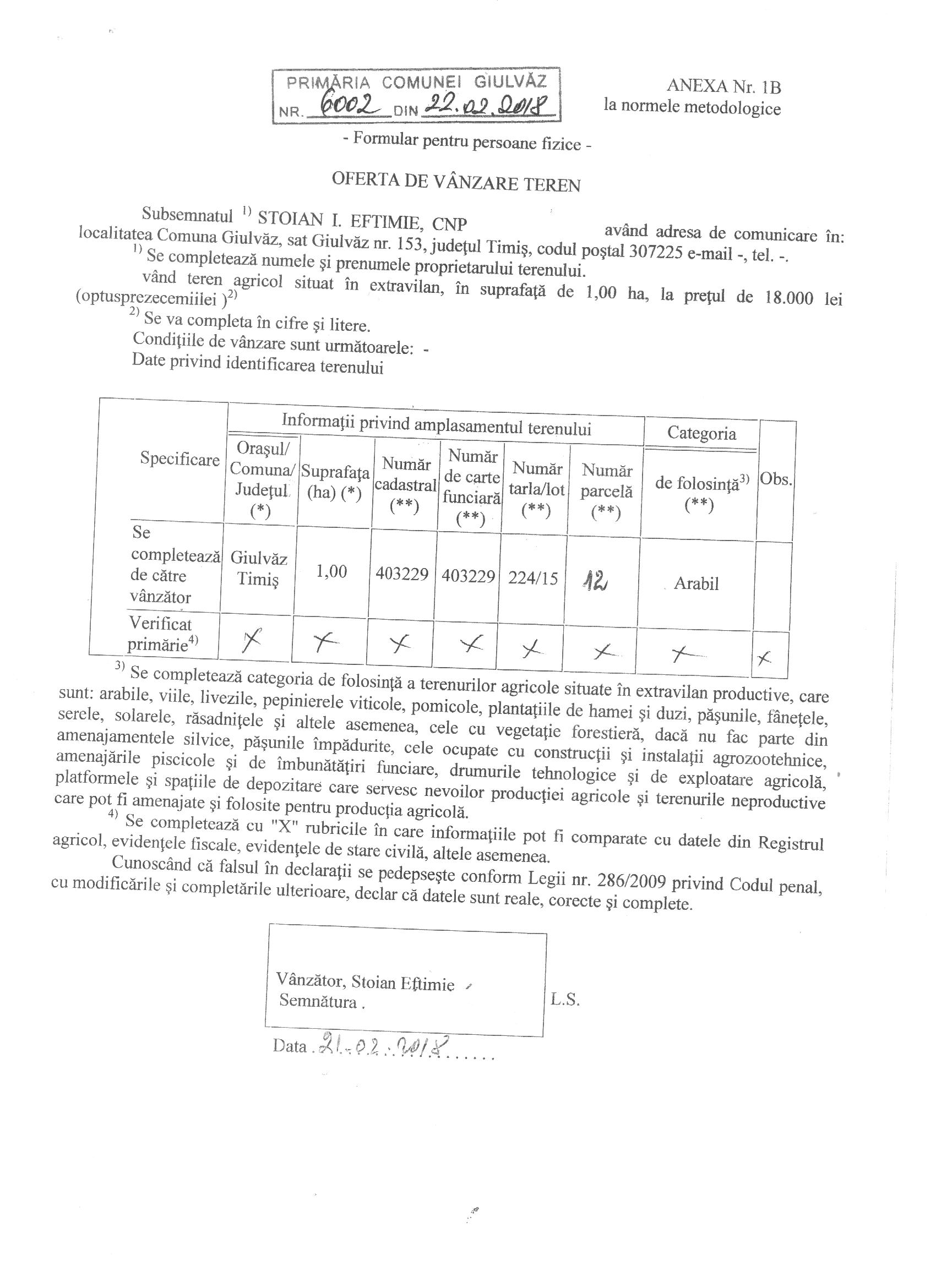 Oferta de vanzare depusa de Stoian Eftimie 1,00 ha CF 403229