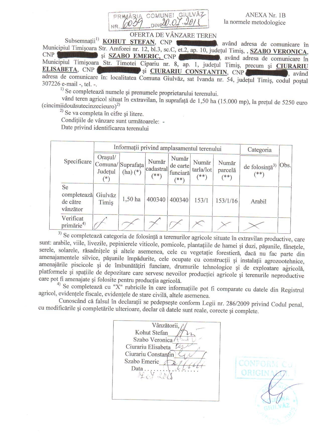 Oferta vanzare teren KOHUT STEFAN, SZABO VERONICA, SZABO EMERIC, CIURARIU ELISABETA si CIURARIU CONSTANTIN