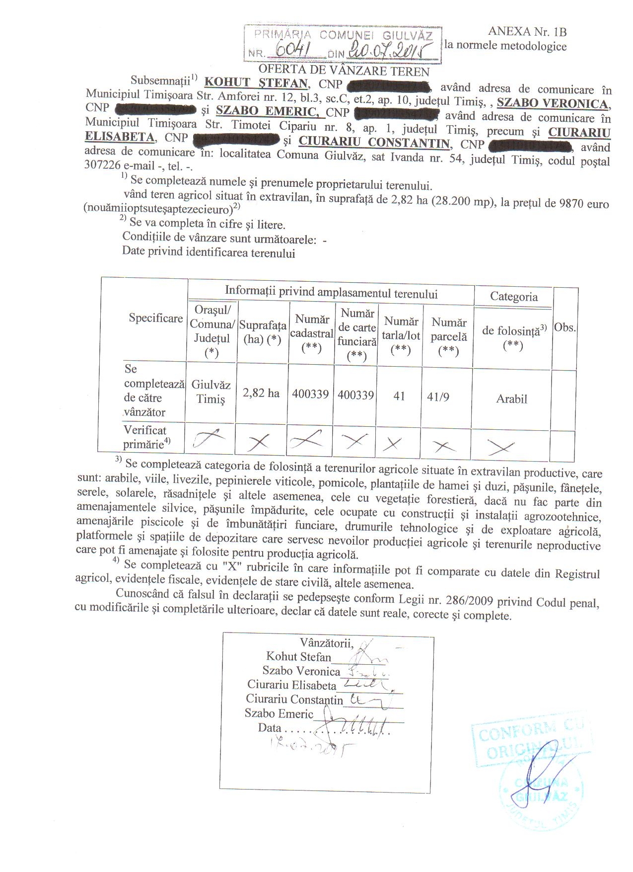 Oferta vanzare teren KOHUT STEFAN, SZABO VERONICA, SZABO EMERIC, CIURARIU ELISABETA si CIURARIU CONSTANTIN
