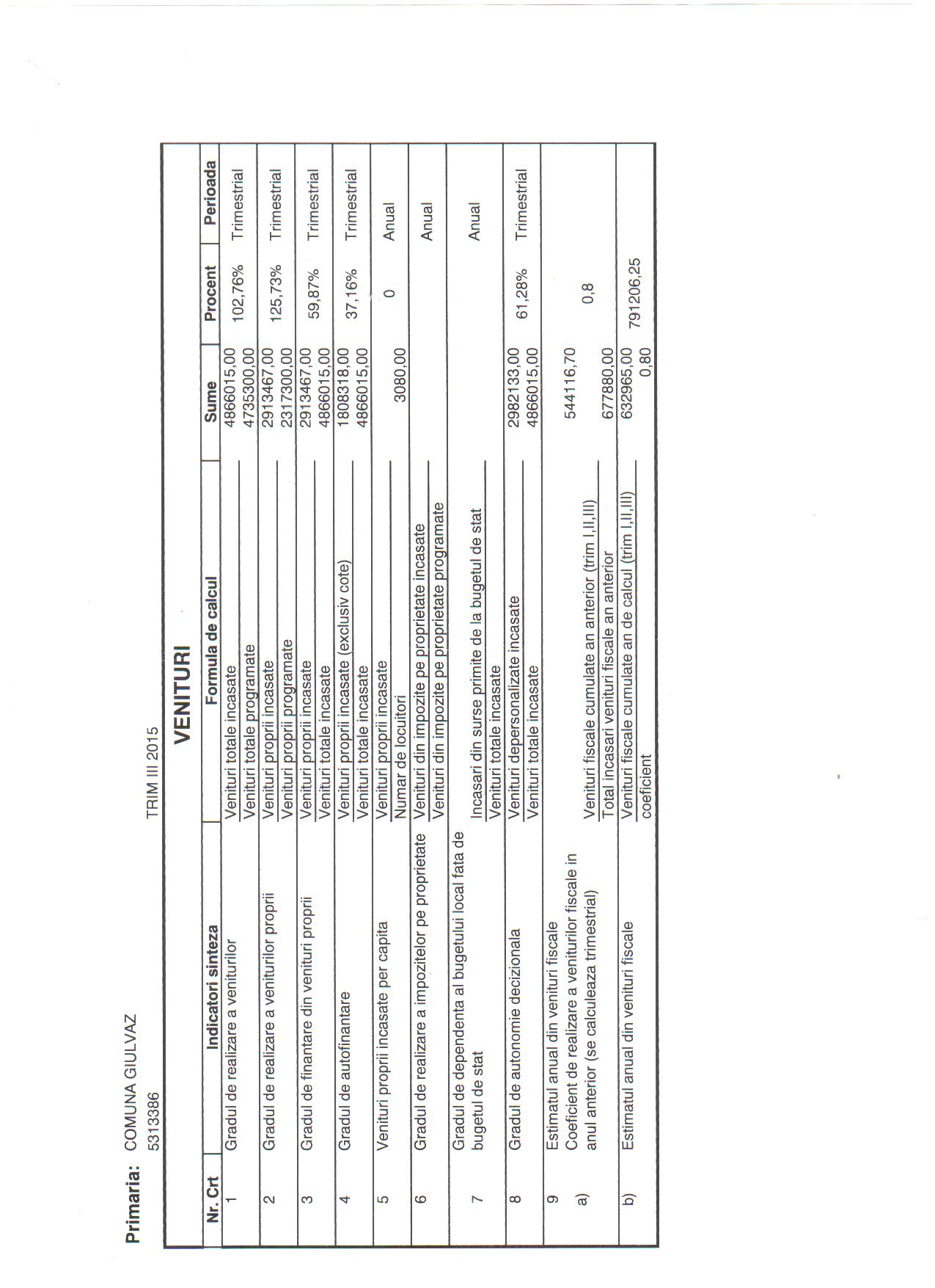 Indicatori venituri executie bugetara trim.III 2015