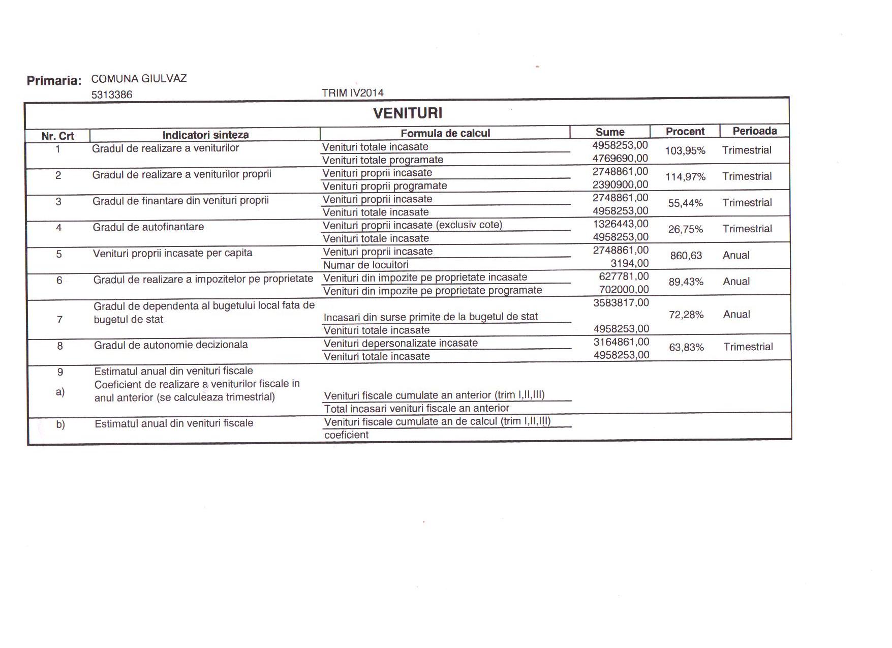Indicatori venituri executie bugetara trim.IV 2014